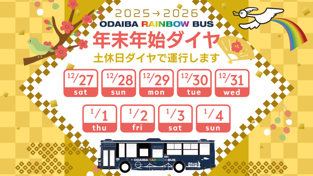 お台場レインボーバスは2025年12月27日(土曜日)から2026年1月4日(日曜日)の間、土休日ダイヤで運行いたします。