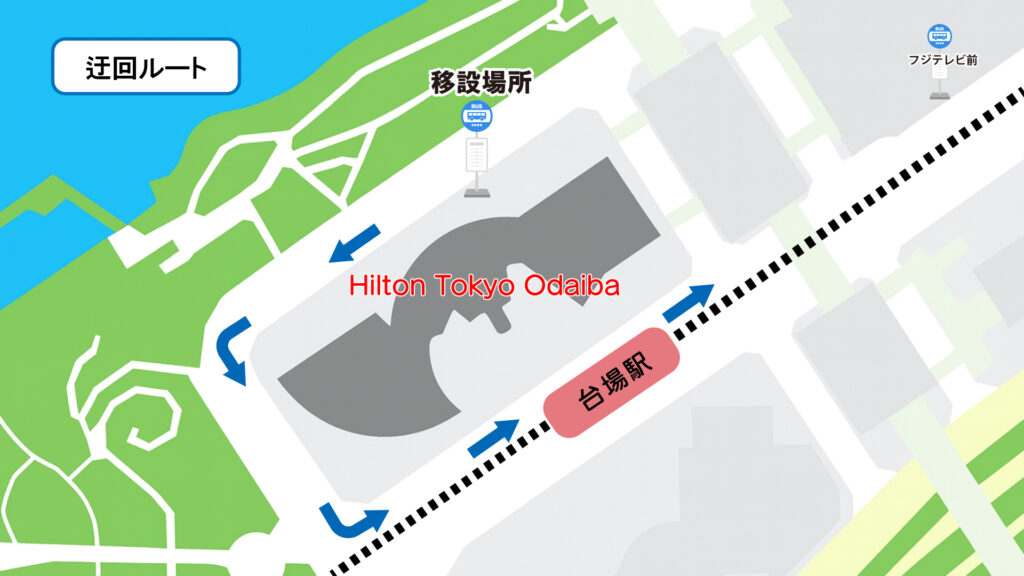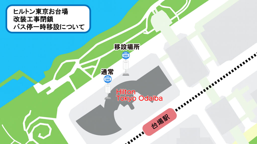 この度、「ヒルトン東京お台場」の全館改装工事に伴い、ホテル敷地内への立ち入りが制限されるため、下記期間中、バス停を一時的に移設し、運行経路を一部変更いたします。